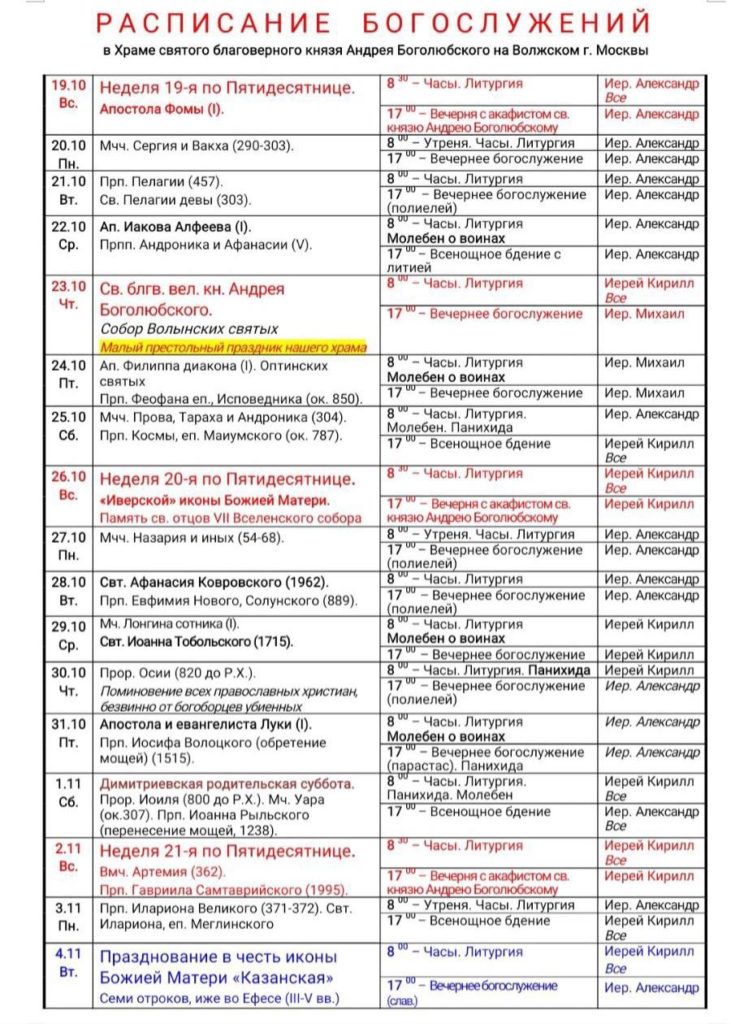 Расписание богослужений