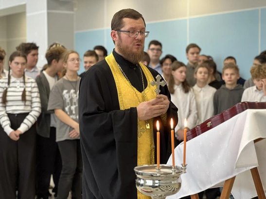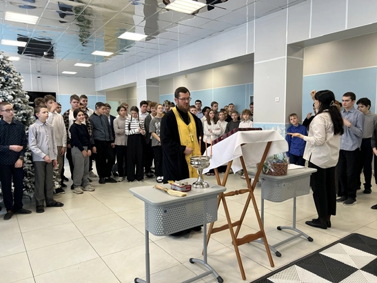 Был совершен краткий молебен в честь Крещения Господня, на котором молились дети и педагоги. Священник призвал в молитвах упомянуть и своих близких. Многие дети и взрослые осеняли себя крестным знамением. По окончании молитвы «о зде начальствующих, учащих и учащихся» отец Кирилл окропил всех желающих Крещенской водой.