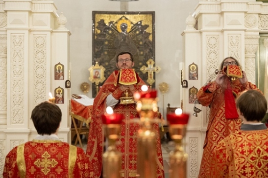Божественную Литургию возглавил настоятель храма иерей Кирилл Краев, ему сослужили иерей Александр Ломоносов и протодиакон Сергий Шевёлкин. Во время литургии пел хор храма под управлением Зологиной Татьяны.